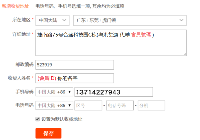 第二步 : 網上購物時使用本東莞倉收貨地址(廣東东莞市虎门镇捷南路75号合盛科技园C栋(粵港集運 代轉 會員號碼 )